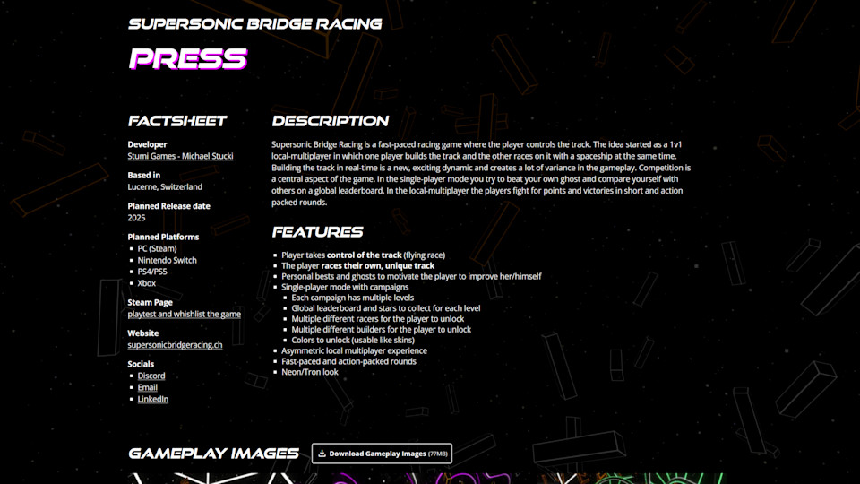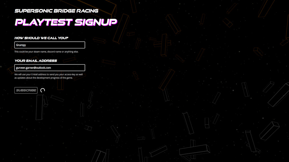 Um mein Spiel zu präsentieren und Spielern die Möglichkeit zu geben, sich für den Newsletter anzumelden, habe ich eine kleine Website für Supersonic Bridge Racing erstellt.